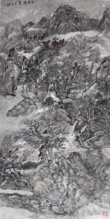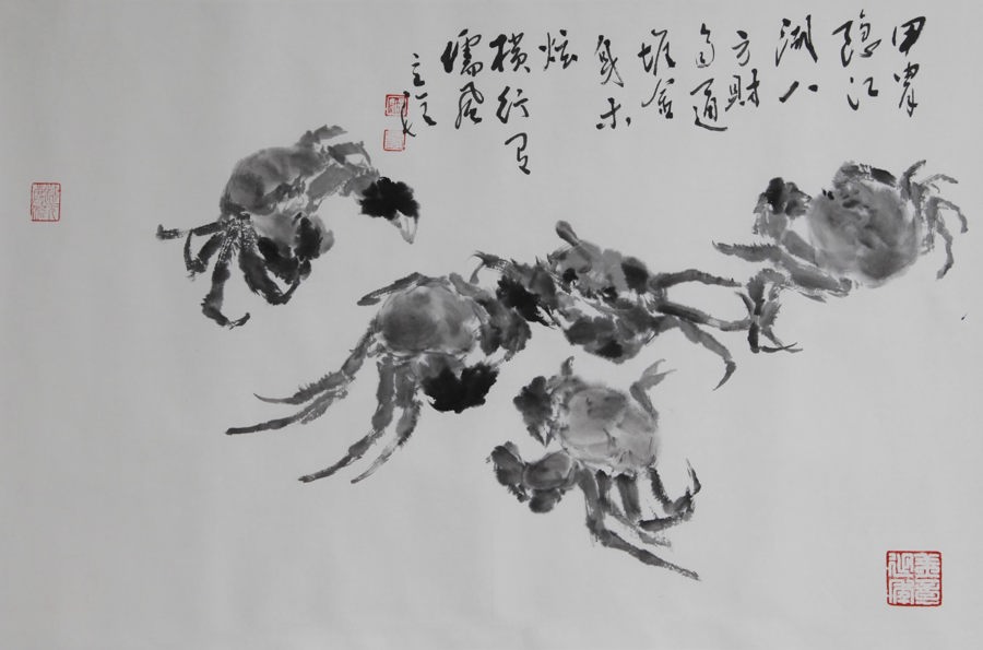 画家季平的水墨画《山水》色墨与线条的融会,介于抽象和具象之间,给人以丰富的想象。季平用笔厚重有力,有浓郁的书写意味,用墨酣畅淋漓,恣意的泼墨突破了前人的常规。他用黑白二色积染、重合,凸显当代水墨画的节律。城市山水用淡墨书写,渲染这座城市节奏和山水气息;和露摘黄花,带霜烹紫蟹,在中国丰富多彩的节气文化中,螃蟹无疑占据着举足轻重的地位。另一件水墨作品《横行自儒风》则呼应了秋风送爽的节气。