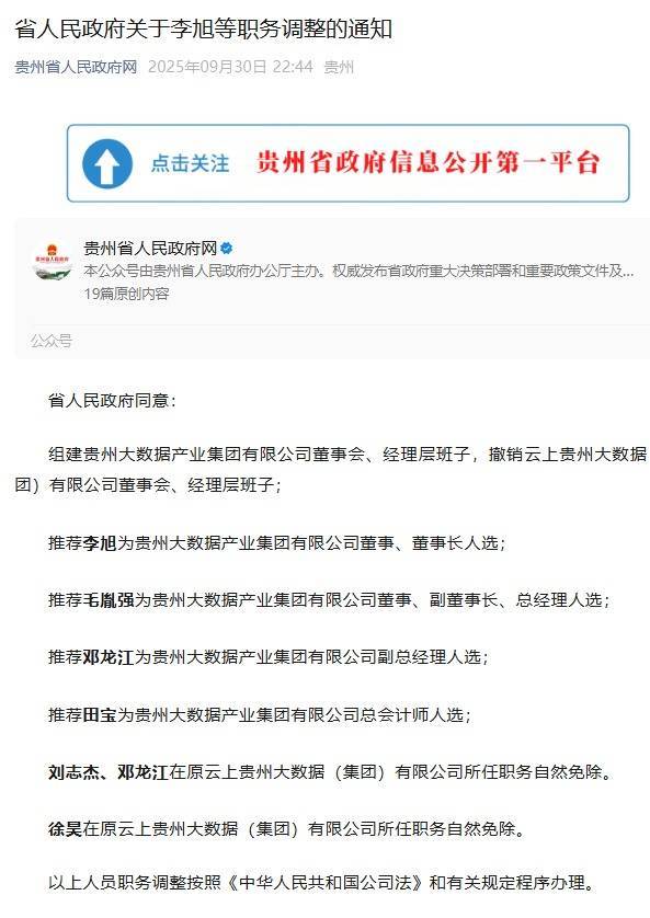 据贵州省政府网站9月30日消息,贵州省政府决定组建贵州大数据产业集团有限公司董事会、经理层班子,撤销云上贵州大数据(集团)有限公司董事会、经理层班子。