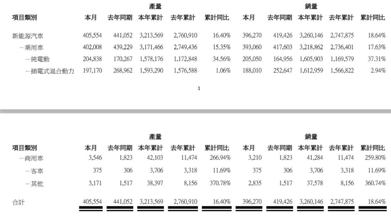 数据显示,比亚迪9月新能源汽车销量约39.63万辆,去年同期约为41.94万辆;本年累计销量约326.01万辆,累计同比增长18.64%;9月比亚迪新能源汽车产量约为40.56万辆,去年同期约为44.11万辆,今年累计产量约为321.36万辆,累计同比增长16.40%。